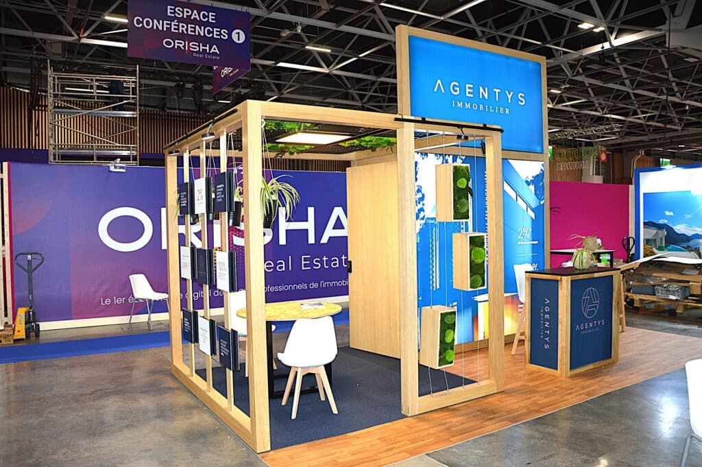 Exemple de stand évènementiel modulable, en bois écoresponsable, de 16m²